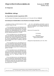 Drucksache 18 / 10 065 Schriftliche Anfrage 18. Wahlperiode Schriftliche Anfrage des Abgeordneten Joschka Langenbrinck (SPD) vom 08. November 2016 (Eingang beim Abgeordnetenhaus am 18. November 2016) und Antwort Entwicklung der Schulabschlüsse in den Bezirken im Schuljahr 2015/2016 Im Namen des Senats von Berlin beantworte ich Ihre Zu 1. bis 5.: Die Ergebnisse der Statistik zu den Ab- Schriftliche Anfrage wie folgt: schlüssen der Schülerinnen und Schüler liegen jährlich ab Januar des Folgejahres, für das Schuljahr 2015/2016 ab 1. Wie viele Schüler und wie viele Schülerinnen deut- Januar 2017, vor. scher und nichtdeutscher Herkunftssprache haben insge- samt und in den einzelnen Berliner Bezirken im Schuljahr 2015/2016 einen Hauptschulabschluss bzw. die Berufs- Berlin, den 29. November 2016 bildungsreife gemacht (Auflistung absolut und prozentual, bitte die Auflistung analog der Drs. 17/17789)? In Vertretung 2. Wie viele Schüler und wie viele Schülerinnen deut- scher und nichtdeutscher Herkunftssprache haben insge- Mark Rackles samt und in den einzelnen Berliner Bezirken im Schuljahr Senatsverwaltung für Bildung, 2015/2016 einen erweiterten Hauptschul-abschluss bzw. Jugend und Wissenschaft die erweiterte Berufsbildungsreife gemacht (Auflistung absolut und prozentual, bitte die Auflistung analog der Drs. 17/17789)? (Eingang beim Abgeordnetenhaus am 01. Dez. 2016) 3. Wie viele Schüler und wie viele Schülerinnen deut- scher und nichtdeutscher Herkunftssprache haben insge- samt und in den einzelnen Berliner Bezirken im Schuljahr 2015/2016 einen Mittleren Schulabschluss gemacht (Auf- listung absolut und prozentual, bitte die Auflistung analog der Drs. 17/17789)? 4. Wie viele Schüler und wie viele Schülerinnen deut- scher und nichtdeutscher Herkunftssprache haben insge- samt und in den einzelnen Berliner Bezirken im Schuljahr 2015/2016 das Abitur gemacht (Auflistung absolut und prozentual, bitte die Auflistung analog der Drs. 17/17789)? 5. Wie viele Schüler und wie viele Schülerinnen deut- scher und nichtdeutscher Herkunftssprache haben insge- samt und in den einzelnen Berliner Bezirken im Schuljahr 2015/2016 die Schule ohne einen Schul-abschluss verlas- sen (Auflistung absolut und prozentual, bitte die Auflis- tung analog der Drs. 17/17789)? Die Drucksachen des Abgeordnetenhauses sind bei der Kulturbuch-Verlag GmbH zu beziehen. Hausanschrift: Sprosserweg 3, 12351 Berlin-Buckow · Postanschrift: Postfach 47 04 49, 12313 Berlin, Telefon: 6 61 84 84; Telefax: 6 61 78 28.