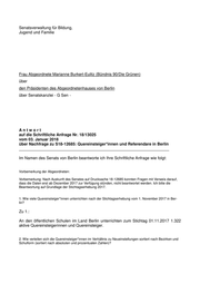 Drucksache 18 / 13 025 Schriftliche Anfrage 18. Wahlperiode Schriftliche Anfrage der Abgeordneten Marianne Burkert-Eulitz (GRÜNE) vom 03. Januar 2018 (Eingang beim Abgeordnetenhaus am 04. Januar 2018) zum Thema: Nachfrage zu S18-12685: Quereinsteiger*innen und Referendare in Berlin und Antwort vom 17. Januar 2018 (Eingang beim Abgeordnetenhaus am 24. Jan. 2018) Die Drucksachen des Abgeordnetenhauses sind bei der Kulturbuch-Verlag GmbH zu beziehen. Hausanschrift: Sprosserweg 3, 12351 Berlin-Buckow · Postanschrift: Postfach 47 04 49, 12313 Berlin, Telefon: 6 61 84 84; Telefax: 6 61 78 28.