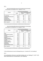 -2- Zu 2.: 1) Aktive Neueinstellungenund darunter Quereinsteigerinnen/Quereinsteiger nach Schularten zum Schuljahr 2017/18 - Stichtag 01.11.2017 Anzahl aktive Neueinstellungen Schulart darunter Quereinsteiger/innen gesamt absolut Anteil in % Grundschulen 1.087 300 27,6 Integrierte Sekundarschulen 789 151 19,1 Gymnasien 406 41 10,1 Sonderschulen 112 29 25,9 Berufliche Schulen 224 50 22,3 Zweiter Bildungsweg 17 1 5,9 Berlin insgesamt 2.635 572 21,7 1) ohne Lehramtsanwärterinnen/Lehramtsanwärter und Studienreferendarinnen/Studienreferendare 1) Aktive Neueinstellungenund darunter Quereinsteigerinnen/ Quereinsteiger nach Regionen zum Schuljahr 2017/18 - Stichtag 01.11.2017 Anzahl aktive Neueinstellungen Region darunter Quereinsteiger/innen gesamt absolut Anteil in % Mitte 233 60 25,8 Friedrichshain-Kreuzberg 193 36 18,7 Pankow 209 34 16,3 Charlottenburg-Wilmersdorf 173 33 19,1 Spandau 215 59 27,4 Steglitz-Zehlendorf 202 34 16,8 Tempelhof-Schöneberg 226 39 17,3 Neukölln 230 64 27,8 Treptow-Köpenick 134 30 22,4 Marzahn-Hellersdorf 173 30 17,3 Lichtenberg 192 51 26,6 Reinickendorf 196 47 24,0 Zentral verwaltete Schulen 259 55 21,2 Berlin insgesamt 2.635 572 21,7 1) ohne Lehramtsanwärterinnen/Lehramtsanwärter und Studienreferendarinnen/Studienreferendare 3. Wie viele Referendare sind nach der Stichtagserhebung vom 1. November 2017 in der Ausbildung? Zu 3.: An den öffentlichen Schulen im Land Berlin befinden sich zum Stichtag 01.11.2017 1.674 aktive Referendarinnen und Referendare in der Ausbildung.