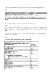 -3- 4. Wie verteilen sich die Referendare und Quereinsteiger*innen schulscharf auf die Berliner Schulen? Zu 4.: 639 öffentliche Schulen haben Referendarinnen und Referendare und/oder Quereinsteige- rinnen und Quereinsteiger, darunter haben 213 Schulen ein bis zwei Referendarinnen und Referendare und/oder Quereinsteigerinnen und Quereinsteiger. Auf Grund der hohen Anzahl von Schulen mit nur einem bzw. zwei Referendarinnen und Referendaren und/oder Quereinsteigenden ist die Rückverfolgbarkeit von Individuen bei der Auflistung der Einzelschulen möglich, weshalb auf die angefragte Darstellung verzich- tet wird. 5. Wie viele Quereinsteiger*innen und Referendare sind an Grundschulen tätig? Zu 5.: An den öffentlichen Grundschulen im Land Berlin sind zum Stichtag 01.11.2017 750 aktive Quereinsteigerinnen und Quereinsteiger und 223 aktive Referendarinnen und Referendare tätig. 6. Wie viele Quereinsteiger*innen müssen zurzeit ein zweites Fach nachstudieren (sortiert nach Schulform, Fach, Beginn der Ausbildung)? Zu 6.: Die Antwort ist der nachfolgenden Tabelle zu entnehmen. Übersicht Teilnehmendenzahlen in den Quereinstieg - berufsbegleitende Studien (bbSt) - Ausbildungsbeginn Schuljahr 2017/2018 A) Grundschule bbSt Mathematik 122 bbSt Deutsch 122 bbSt Naturwissenschaften 15 bbSt Englisch 0 Summe Grundschule 259 B) Integrierte Sekundarschule (ISS)/Gymnasium (Gym) und berufliche Schulen bbSt WAT 0 bbSt Mathematik 50 bbSt Informatik 9 bbSt Psychologie 2 bbSt Englisch 22 Summe ISS/Gym/ berufliche Schulen 83 Summe Gesamt 342