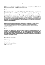 -4- 7. Welche weiteren Maßnahmen plant der Senat zur Stärkung von Quereinsteiger*innen und Referendaren? Welchen Stand hat das in Drs. 18-12685 genannte Gesamtkonzept? Zu 7.: Das Abgeordnetenhaus hat im Haushaltsgesetz mit Verabschiedung des Haushalts 2018/2019 im Dezember 2017 ein umfassendes Maßnahmenpaket zur Unterstützung von Quereinsteigerinnen und Quereinsteigern ins Lehramt verabschiedet, das unter anderem zusätzliche Entlastungsstunden für Quereinsteigende und frühzeitige und verbesserte Be- gleitmaßnahmen vorsieht. Um diese Maßnahmen bei der geplanten Überarbeitung des Quereinstiegs zu berücksichtigen, wurde ein multiprofessionelles Arbeitsbündnis mit Schulaufsichten und Schulleitungen gegründet, das ein entsprechendes Gesamtkonzept entwickeln wird. Das Arbeitsbündnis hat die Arbeit aufgenommen und wird einen entspre- chenden Entwurf erarbeiten. 8. Welche Unterstützungsmaßnahmen bestehen insbesondere für Schulleitungen an Schulen mit einer hohen Anzahl von auszubildenden Lehrkräften, um die Integration von Quereinsteiger*innen und Referendaren zu gewährleisten (mit der Bitte um Aufzählung der angebotenen Maßnahmen durch die regionale Schulaufsicht)? Zu 8.: Die unter zu 7. angeführten Maßnahmen sehen zusätzliche Unterstützungsformate für Schulen mit hoher Ausbildungstätigkeit vor. Wie genau diese Vorhaben umgesetzt wer- den, wird Teil der neuen Gesamtkonzeption sein. Zurzeit erhalten die Schulen zwei zu- sätzliche Stunden für jeden Quereinsteigenden, über deren Verwendung die Schulleitun- gen selbst entscheiden können. Berlin, den 17. Januar 2018 In Vertretung Mark Rackles Senatsverwaltung für Bildung, Jugend und Familie