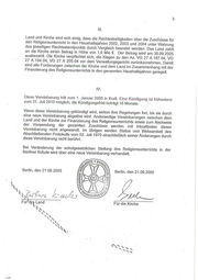 Land und Kirche sind sich einig, dass die Rechtsstreitigkeiten über die Zuschüsse für den Religionsunterricht in den Haushaltsjahren 2002, 2003 und 2004 unter Wahrung des jeweiligen Rechtsstandpunkts durch Vergleich beendet werden. Das Land zahlt an die Kirche einen Betrag in Höhe von 1,6 Mio €. Der Betrag wird am 30.09.2005 ausbezahlt. Die Kirche verpflichtet sich, die Klagen zu den Az. VG 27 A 167.04, VG 27 A 194.04, VG 27 A 205.04 vor dem Verwaltungsgericht zurückzunehmen. Damit sind alle Forderungen zwischen der Kirche und dem Land: im Zusammenhang mit der Finanzierung des Religionsunterrichts in den genannten Haushaltsjahren geregelt. IV. Diese Vereinbarung tritt zum 1. Januar 2005 in Kraft. Eine Kündigung ist frühestens zum 31. Juli 2010 möglich; die Kündigungsfrist beträgt 18 Monate. Wenn diese Vereinbarung gekündigt wird, wirken ihre Regelungen fort, bis sie durch eine neue Vereinbarung abgelöst wird. Anderweitige Vereinbarungen zwischen dem Land und der Kirche zur Finanzierung des Religionsunterrichts sowie zum Nachweis der Verwendung der gezahlten Zuschüsse werden mit Inkrafttreten dieser Vereinbarung nicht angewandt. Im übrigen werden Status und Wirksamkeit des Abschließenden Protokolls vom 02, Juli 1970 einschließlich seiner Änderungen durch diese Vereinbarung nicht berührt. Bei Veränderung der schulgesetzlichen Stellung des Religionsunterrichts in der Berliner Schule wird über eine neue Vereinbarung verhandelt. Berlin, den 21.09.2005 Berlin, den 21.09.2005 2 Br =, Ä s \L ar: Krler Fürigs Land Für die Kirche a \ N \ nd NN ey X, & II ,