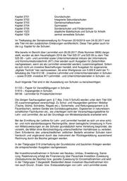 Senatsverwaltung für Bildung, Jugend und Familie Frau Abgeordnete Stefanie Remlinger (Bündnis 90/Die Grünen) über den Präsidenten des Abgeordnetenhauses von Berlin über Senatskanzlei - G Sen - Antwort auf die Schriftliche Anfrage Nr. 18/14 880 vom 30. April 2018 über Grund- und Erstausstattung von Schulen ___________________________________________________________________ Im Namen des Senats von Berlin beantworte ich Ihre Schriftliche Anfrage wie folgt: 1. Wer ist für die Grund- und Erstausstattung mit Möbeln und sonstigen Einrichtungsgegenständen sowie Lehrmitteln bei einer Schule zuständig? Wer ist für die Schulhöfe verantwortlich? Wo sind ent- sprechende Mittel dafür etatisiert (mit Kapitel, Titel)? 2. Inwiefern verändert sich diese Zuständigkeit bei Neubau und Erstbezug eines Schulgebäudes, bei Kapazitätserweiterung und bei Reaktivierung eines bestehenden Schulgebäudes? 7. Wie verhält es sich mit Möbeln und sonstigen Einrichtungsgegenständen sowie Lehrmitteln, wenn eine Schule ihren Standort bzw. einen Bezirk wechselt? Zu 1. , 2. und 7.: Auf der Grundlage des § 109 Absatz 1 Schulgesetz (SchulG) „… Den Bezirken ob- liegt die Verwaltung und Unterhaltung der äußeren Angelegenheit der allgemein bil- denden Schulen mit Ausnahme der zentral verwalteten Schulen (zuständige Schul- behörde). Hierzu zählen die Maßnahmen zur Schaffung der äußeren Voraussetzun- gen für das Lehren und Lernen in der Schule, insbesondere der Bau, die Ausstattung und die Unterhaltung der Schulen…“ sind die Schulämter als Schulträger für die Grund- und Erstausstattung mit Möbeln und sonstigen Einrichtungsgegenständen sowie der Lehr- und Lernmittel der Schulen zuständig. Jeder Schulträger (Bezirke bzw. Senatsverwaltung für Bildung, Jugend und Familie) ist für seine Schulen ver- antwortlich. In den Haushaltsplänen der Bezirke sind die Kapitel für die verschiedenen Schular- ten eingerichtet.
