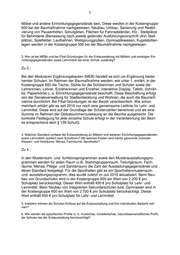 3 Möbel und andere Einrichtungsgegenstände sein. Diese werden in der Kostengruppe 600 bei der Baumaßnahme nachgewiesen. Neubau, Umbau, Sanierung und Reakti- vierung von Pausenhöfen, Schulgärten, Flächen für Fahrradständer, Kfz.- Stellplätze für Behinderte (Bemessung nach jeweils geltender Ausführungsvorschrift (AV) Stell- plätze), Spielfelder, Laufbahnen, Weitsprunggruben, Gymnastikwiesen, Kugelstoßan- lagen werden in der Kostengruppe 500 bei der Baumaßnahme nachgewiesen. 3. Wer ist bei MEBs und bei Filial-Gründungen für die Erstausstattung mit Möbeln und sonstigen Ein- richtungsgegenständen sowie Lehrmitteln bei einer Schule zuständig? Zu 3.: Bei den Modularen Ergänzungsbauten (MEB) handelt es sich um Ergänzung beste- hender Schulen. Im Rahmen der Baumaßnahme werden, wie unter 1. erklärt, in der Kostengruppe 600 die Tische, Stühle für die Schülerinnen und Schüler sowie die Lehrerinnen, Lehrer, Erzieherinnen und Erzieher, interaktive Display, Tafeln, Schrän- ke, Papierkörbe u. a. Einrichtungsgegenstände beschafft. Diese Beschaffung erfolgt von der Senatsverwaltung für Stadtentwicklung und Wohnen, die auch die Baumaß- nahme durchführt. Bei Filial-Gründungen ist der Bezirk verantwortlich. Wie schon mehrfach erklärt gibt es seit 2016 nur noch eine gemeinsame Leitlinie für Lehr- und Lernmittel. Diese wird auf der Grundlage der Schülerzahlen berechnet und als eine Summe im Rahmen der Globalsummenzuweisung an die Bezirke ausgereicht. Die konkrete Festlegung für jede einzelne Schule erfolgt in der Verantwortung der Bezir- ke entsprechend dem § 109 SchulG. 4. Welchen Standard umfasst die Erstausstattung an Möbeln und weiteren Einrichtungsgegenständen sowie Lehrmitteln (sortiert nach Schulform)? Mit welchen Kosten wird hierfür gerechnet (normale Klassen- und Horträume, Mensa, Fachräume, Sporthalle)? Zu 4.: In den Musterraum- und -funktionsprogrammen sowie den Musterausstattungspro- grammen werden für jeden Raum (z.B. Stammgruppenraum, Teilungsraum, Fach- räume, Mensa, Pflege- und Sanitärraum) die Zahl der Ausstattungsgegenstände und deren Standard festgelegt. Für die Sporthallen gibt es ein Sporthallenmusterraum- und -ausstattungsprogramm, dies wurde zuletzt im Juli 2016 aktualisiert. Beim Neu- bau von Grundschulen wird in der Kostengruppe 600 ein Wert von 2.200 € pro Schulplatz berücksichtigt. Dieser Wert enthält 450 € pro Schulplatz für Lehr- und Lernmittel. Beim Neubau von Integrierten Sekundarschulen bzw. Gymnasien wird in der Kostengruppe 600 ein Wert von 2.700 € pro Schulplatz berücksichtigt. Dieser Wert enthält 600 € pro Schulplatz für Lehr- und Lernmittel. 5. Inwiefern können die Schulen Einfluss auf die Erstausstattung und ihre individuellen Bedarfe neh- men? 6. Wie werden die spezifischen Profile (z. b. musisches, künstlerisches, naturwissenschaftliches Profil) der Schulen bei der Erstausstattung berücksichtigt?