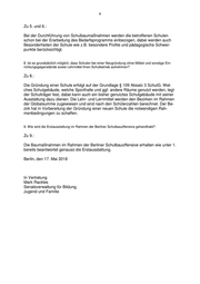 4 Zu 5. und 6.: Bei der Durchführung von Schulbaumaßnahmen werden die betroffenen Schulen schon bei der Erarbeitung des Bedarfsprogramms einbezogen, dabei werden auch Besonderheiten der Schule wie z.B. besondere Profile und pädagogische Schwer- punkte berücksichtigt. 8. Ist es grundsätzlich möglich, dass Schulen bei einer Neugründung ohne Möbel und sonstige Ein- richtungsgegenstände sowie Lehrmittel ihren Schulbetrieb aufnehmen? Zu 8.: Die Gründung einer Schule erfolgt auf der Grundlage § 109 Absatz 3 SchulG. Wel- ches Schulgebäude, welche Sporthalle und ggf. andere Räume genutzt werden, legt der Schulträger fest, dabei kann auch ein bisher genutztes Schulgebäude mit seiner Ausstattung dazu dienen. Die Lehr- und Lernmittel werden den Bezirken im Rahmen der Globalsumme zugewiesen und sind nach den Schülerzahlen berechnet. Der Be- zirk hat in Vorbereitung der Gründung einer neuen Schule die notwendigen Rah- menbedingungen zu schaffen. 9. Wie wird die Erstausstattung im Rahmen der Berliner Schulbauoffensive gehandhabt? Zu 9.: Die Baumaßnahmen im Rahmen der Berliner Schulbauoffensive erhalten wie unter 1. bereits beantwortet genauso die Erstausstattung. Berlin, den 17. Mai 2018 In Vertretung Mark Rackles Senatsverwaltung für Bildung, Jugend und Familie