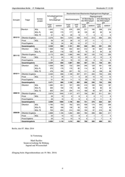 Abgeordnetenhaus Berlin – 17. Wahlperiode Drucksache 17 / 13 252 Absolventeninnen/Absolventen/Abgängerinnen/Abgänger Schulabgängerinnen Abgangszeugnis und Schüler- Abschlusszeugnis mit Beendigung ohne Beendigung Schuljahr Träger Schulabgänger gruppe des Bildungsgan- des Bildungsgan- ges ges insge- insge- weib- insge- insge- weiblich weiblich weiblich samt samt lich samt samt Öffentlich BQL 1.843 715 876 339 371 160 596 216 BQL-FL 402 173 177 90 135 49 90 34 BQL-TZ 31 16 20 9 7 4 4 3 2012/13 Öffentlich Ergebnis 2.276 904 1.073 438 513 213 690 253 Privat BQL 56 24 28 12 27 11 1 1 Privat Ergebnis 56 24 28 12 27 11 1 1 Gesamtergebnis 2.332 928 1.101 450 540 224 691 254 Öffentlich BQL 1.869 708 933 384 312 94 624 230 BQL-FL 304 118 135 62 75 31 94 25 Öffentlich Ergebnis 2.173 826 1.068 446 387 125 718 255 2011/12 Privat BQL 51 24 19 12 20 6 12 6 Privat Ergebnis 51 24 19 12 20 6 12 6 Gesamtergebnis 2.224 850 1.087 458 407 131 730 261 Öffentlich BQL 1.569 586 732 299 346 129 491 158 BQL-FL 375 170 170 80 114 60 91 30 BQL-TZ 476 180 207 78 111 44 158 58 2010/11 Öffentlich Ergebnis 2.420 936 1.109 457 571 233 740 246 Privat BQL 51 30 11 5 25 13 15 12 Privat Ergebnis 51 30 11 5 25 13 15 12 Gesamtergebnis 2.471 966 1.120 462 596 246 755 258 Öffentlich BQL 1.680 651 727 295 419 169 534 187 BQL-FL 394 150 176 68 138 50 80 32 BQL-TZ 600 244 234 114 169 48 197 82 2009/10 Öffentlich Ergebnis 2.674 1045 1.137 477 726 267 811 301 Privat BQL 25 15 9 6 5 3 11 6 Privat Ergebnis 25 15 9 6 5 3 11 6 Gesamtergebnis 2.699 1060 1.146 483 731 270 822 307 Öffentlich BQL 1.765 703 752 323 458 174 555 206 BQL-FL 380 168 136 58 132 68 112 42 BQL-TZ 723 234 314 108 194 57 215 69 2008/09 Öffentlich Ergebnis 2.868 1.105 1.202 489 784 299 882 317 Privat BQL 22 14 13 9 2 1 7 4 Privat Ergebnis 22 14 13 9 2 1 7 4 Gesamtergebnis 2.890 1.119 1.215 498 786 300 889 321 Berlin, den 07. März 2014 In Vertretung Mark Rackles Senatsverwaltung für Bildung, Jugend und Wissenschaft (Eingang beim Abgeordnetenhaus am 19. Mrz. 2014) 4