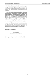 Drucksache 17 / 10 133 Kleine Anfrage 17. Wahlperiode Kleine Anfrage der Abgeordneten Marion Platta (LINKE) vom 23. Januar 2012 (Eingang beim Abgeordnetenhaus am 24. Januar 2012) und Antwort Bilanz für hilfebedürftige Kinder ein Jahr nach dem Ende des Förderprogramms „Kids in die Sportklubs“ Im Namen des Senats von Berlin beantworte ich Ihre des Bildungs- und Teilhabepaketes durch die Bundes- Kleine Anfrage wie folgt: regierung für bis zu 10 € pro Monat Sport? Um welche Sportarten handelt es sich dabei? 1. Wie beurteilt der Senat die Situation der Teilhabe von hilfebedürftigen Kindern in Sportvereinen nach der Zu 2.: Die kulturelle Teilhabe des Bildungs- und Teil- Beendigung des Förderprogramms „Kids in die Sport- habepakets bezieht sich sowohl auf Sport als auch auf klubs“, mit dem bis zum 31.12.2010 rund 2.750 hilfe- Freizeit und Kultur. Eine differenzierte Erhebung von bedürftigen Berliner Kindern eine kostenlose Mit- Anträgen aus dem Sport, Kultur oder Freizeit erfolgt gliedschaft in einem Sportverein ermöglicht wurde? aufgrund des Erhebungsaufwandes nicht. Deshalb ist keine Auskunft über die konkrete Teilhabe im Sportverein Zu 1.: Der Senat sieht das in den Jahren 2008 bis 2010 und insbesondere auch nicht zu den einzelnen Sportarten durchgeführte Projekt „Kids in die Sportklubs“ als einen möglich. gelungenen Beitrag der Teilhabeförderung. Die Um- setzung des strategischen Ziels „Sport für Alle!“ des Leit- Die Sportjugend Berlin e.V. bzw. der Landessportbund bilds für die Sportmetropole Berlin konnte für sozial Berlin e.V. haben in der Übergangsphase Anfang 2011 benachteiligte Kinder und Jugendliche ein Stück weit offensiv die Berliner Vereine und Verbände über die voran gebracht werden. Die zum 1. Januar 2011 in Kraft Rahmenbedingungen und Formulare informiert. getretenen Regelungen des Bildungs- und Teilhabepakets Insbesondere die am Projekt teilnehmenden Vereine und sehen eine Unterstützung von Kindern und Jugendlichen Verbände wurden unterrichtet. für die kulturelle teilhabe vor. Anspruchsberechtigt sind Nachdem das Bildungs- und Teilhabepaket nunmehr Kinder und Jugendliche aus Familien, die Arbeitslosen- seit einem Jahr in Kraft ist, hat die Sportjugend Berlin geld II, Sozialgeld, Sozialhilfe Kinderzuschlag, Wohngeld e.V. sich einen Eindruck über die Umsetzung in Berliner oder Leistungen nach dem Asylbewerberleistungsgesetz Sportvereinen verschafft. Sie hat die rund 150 Sportver- bekommen. Gegenüber dem Projekt „Kids in die Sport- eine befragt, die sich vormals an dem Projekt „Kids in die klubs“ wurde der Kreis der Anspruchsberechtigten damit Sportklubs“ beteiligt hatten. 71 Sportvereine haben sich ausgeweitet. Da eine Doppelförderung nicht zulässig ist, an der Befragung beteiligt. wurde das Projekt „Kids in die Sportklubs“ mit der Ein- In der Auswertung dieser Rückläufe ist festzuhalten, führung des Bildungs- und Teilhabepakets beendet. dass das Antragsverfahren mittlerweile zufriedenstellend gelöst ist und die Vereine die Eltern von Anspruchs- Der Senat begrüßt die gesetzliche Verankerung der Teil- berichtigten beraten, bzw. unterstützen. Nach den An- habeförderung (nicht nur) im Sport. Durch das Bildungs- gaben der Vereine werden über das Bildungspaket mehr und Teilhabepaket wurden die Möglichkeiten für Kinder Mitgliedschaften von Kindern und Jugendlichen unter- aus einkommensschwachen Familien, sich auch in einem stützt als zuvor über „Kids in die Sportklubs“. Sportverein aktiv zu betätigen, gezielt verbessert. Der Die Zahl der Anträge auf Leistungen für die kulturelle Senat wird unabhängig von den Möglichkeiten der Teilhabe und die Rückmeldungen der Vereine an die kulturellen Teilhabe wie bisher auch Projekte unter- Sportjugend Berlin e.V. lassen darauf schließen, dass die stützen, die die Integration von Kindern und Jugendlichen Überleitung der bisher geförderten Teilnehmer und Teil- zum Ziel haben. nehmerinnen in das Bildungs- und Teilhabepaket in den meisten Fällen gelungen ist, und darüber hinaus eine wachsende Zahl von hilfebedürftigen Kindern und 2. In welchen Berliner Sportvereinen treiben wie Jugendlichen die Teilhabe im Sport tatsächlich wahr- viele Berliner Kinder und Jugendliche seit der Einführung nimmt. Die Drucksachen des Abgeordnetenhauses sind bei der Kulturbuch-Verlag GmbH zu beziehen. Hausanschrift: Sprosserweg 3, 12351 Berlin-Buckow · Postanschrift: Postfach 47 04 49, 12313 Berlin, Telefon: 6 61 84 84; Telefax: 6 61 78 28.
