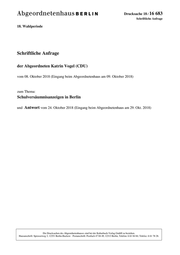 Drucksache 18 / 16 683 Schriftliche Anfrage 18. Wahlperiode Schriftliche Anfrage der Abgeordneten Katrin Vogel (CDU) vom 08. Oktober 2018 (Eingang beim Abgeordnetenhaus am 09. Oktober 2018) zum Thema: Schulversäumnisanzeigen in Berlin und Antwort vom 24. Oktober 2018 (Eingang beim Abgeordnetenhaus am 29. Okt. 2018) Die Drucksachen des Abgeordnetenhauses sind bei der Kulturbuch-Verlag GmbH zu beziehen. Hausanschrift: Sprosserweg 3, 12351 Berlin-Buckow · Postanschrift: Postfach 47 04 49, 12313 Berlin, Telefon: 6 61 84 84; Telefax: 6 61 78 28.