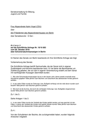 Senatsverwaltung für Bildung, Jugend und Familie Frau Abgeordnete Katrin Vogel (CDU) über den Präsidenten des Abgeordnetenhauses von Berlin über Senatskanzlei - G Sen - Antwort auf die Schriftliche Anfrage Nr. 18/16 683 vom 08. Oktober 2018 über Schulversäumnisanzeigen in Berlin ___________________________________________________________________ Im Namen des Senats von Berlin beantworte ich Ihre Schriftliche Anfrage wie folgt: Vorbemerkung des Senats: Die Schriftliche Anfrage betrifft Sachverhalte, die der Senat nicht in eigener Zuständigkeit und Kenntnis beantworten kann. Er hat daher die Bezirksämter um Zulieferung gebeten, die von dort in eigener Verantwortung erstellt und dem Senat mit nachfolgenden Aussagen übermittelt wurden. 1. Wie viele Schulversäumnisanzeigen hat es in den letzten zehn Jahren jeweils innerhalb eines Schuljahres gegeben? Bitte jährlich nach Bezirken und Geschlecht des abwesenden Kindes getrennt auflisten. 2. In wie vielen Fällen wurde ein Ordnungs- bzw. Bußgeld verhängt und wie viele davon wurden auch bezahlt? Bitte jährlich nach Bezirken getrennt auflisten. 3. Wie hoch ist die Summe, die durch die verhängten Ordnungs- bzw. Bußgelder eingenommen wurde? Bitte jährlich nach Bezirken getrennt auflisten. Zu 1. bis 3.: Siehe Anlagen 1 bis 3. 4. In wie vielen Fällen konnte der Verbleib des Kindes geklärt werden und was geschah mit den Fällen, in denen der Verbleib des Kindes nicht geklärt werden konnte? Bitte jährlich nach Bezirken und Geschlecht des abwesenden Kindes getrennt auflisten. Zu 4.: Von den Schulämtern der Bezirke, die zurückgemeldet haben, wurden folgende Antworten mitgeteilt: