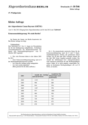 Drucksache 17 / 10 546 Kleine Anfrage 17. Wahlperiode Kleine Anfrage der Abgeordneten Canan Bayram (GRÜNE) vom 31. Mai 2012 (Eingang beim Abgeordnetenhaus am 04. Juni 2012) und Antwort Ermessenseinbürgerung: Wo steht Berlin? Im Namen des Senats von Berlin beantworte ich Ihre Kleine Anfrage wie folgt: Vorbemerkung Den Antworten zu 2. bis 11. liegen im Wesentlichen die für die Einbürgerung maßgeblichen „Vorläufigen Anwendungshinweise des Bundesministeriums des Innern zum Staatsangehörigkeitsgesetz“ vom 19. Zu 1.: Da entsprechende statistische Daten für die Oktober 2007 zugrunde. Ermessenseinbürgerung nach §§ 8 und 9 Staats- angehörigkeitsgesetz (StAG), die gemeinsam erfasst 1. Wie viele Personen haben in den Jahren 2001 werden, erst ab dem Jahr 2002 vorliegen, können für bis 2011 das Jahr 2001 keine Angaben gemacht werden. Die - einen Ermessenseinbürgerungsantrag nach § 8 Anzahl der Ablehnungen bzw. Antragsrücknahmen des Staatsangehörigkeitsgesetzes gestellt wird statistisch gemeinsam für alle Rechtsgrundlagen - wie vielen der Anträge wurde stattgegeben erfasst. Daher ist es nicht möglich, ausgewählte An- - wie viele wurden abgelehnt? gaben zu bestimmten Rechtsgrundlagen, z.B. zu § 8 (Bitte getrennt für die Jahre auflisten.) StAG, zu machen. Anzahl der Ein- Anzahl der Anträge Jahr bürgerungen nach nach §§ 8,9 StAG §§ 8,9 StAG 2002 1119 553 2003 998 600 2004 914 576 2005 1107 570 2006 977 1003 2007 909 926 2008 759 742 2009 728 590 2010 616 472 2011 678 532 Die Drucksachen des Abgeordnetenhauses sind bei der Kulturbuch-Verlag GmbH zu beziehen. Hausanschrift: Sprosserweg 3, 12351 Berlin-Buckow · Postanschrift: Postfach 47 04 49, 12313 Berlin, Telefon: 6 61 84 84; Telefax: 6 61 78 28.