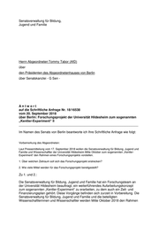 Senatsverwaltung für Bildung, Jugend und Familie Herrn Abgeordneten Tommy Tabor (AfD) über den Präsidenten des Abgeordnetenhauses von Berlin über Senatskanzlei - G Sen - Antwort auf die Schriftliche Anfrage Nr. 18/16538 vom 20. September 2018 über Berlin: Forschungsprojekt der Universität Hildesheim zum sogenannten „Kentler-Experiment“ II ___________________________________________________________________ Im Namen des Senats von Berlin beantworte ich Ihre Schriftliche Anfrage wie folgt: Vorbemerkung des Abgeordneten: Laut Pressemitteilung vom 17. September 2018 wollen die Senatsverwaltung für Bildung, Jugend und Familie und Wissenschaftler der Universität Hildesheim Mitte Oktober zum sogenannten „Kentler- Experiment“ den Rahmen eines Forschungsprojekts vorstellen. 1. Über welchen Zeitraum soll sich das Forschungsprojekt erstrecken? 2. Wie viele Mittel werden für das Forschungsprojekt bereitgestellt? Zu 1. und 2.: Die Senatsverwaltung für Bildung, Jugend und Familie hat ein Forschungsteam an der Universität Hildesheim beauftragt, ein weiterführendes Aufarbeitungskonzept zum sogenannten „Kentler-Experiment“ zu erarbeiten, zu dem auch ein Zeit- und Finanzierungsplan gehört. Diese Vorgänge befinden sich zurzeit in Vorbereitung. Die Senatsverwaltung für Bildung, Jugend und Familie und die beteiligten Wissenschaftlerinnen und Wissenschaftler werden Mitte Oktober 2018 den Rahmen