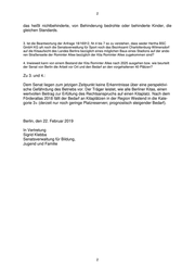 2 das heißt nichtbehinderte, von Behinderung bedrohte oder behinderte Kinder, die gleichen Standards. 3. Ist die Beantwortung der Anfrage 18/16912, Nr.4 bis 7 so zu verstehen, dass weder Hertha BSC GmbH KG aA noch die Senatsverwaltung für Sport noch das Bezirksamt Charlottenburg-Wilmersdorf auf die Kitaaufsicht des Landes Berlins bezüglich eines möglichen Baus eines Stadions auf der ande- ren Straßenseite der Rominter Allee bezüglich der Kita Rominter Allee zugekommen sind? 4. Inwieweit kann von einem Bestand der Kita Rominter Allee nach 2025 ausgehen bzw. wie beurteilt der Senat von Berlin die Arbeit vor Ort und den Bedarf an den vorgehaltenen 40 Plätzen? Zu 3. und 4.: Dem Senat liegen zum jetzigen Zeitpunkt keine Erkenntnisse über eine perspektivi- sche Gefährdung des Betriebs vor. Der Träger leistet, wie alle Berliner Kitas, einen wertvollen Beitrag zur Erfüllung des Rechtsanspruchs auf einen Kitaplatz. Nach dem Förderatlas 2018 fällt der Bedarf an Kitaplätzen in der Region Westend in die Kate- gorie 3+ (derzeit nur noch geringe Platzreserven; prognostisch steigender Bedarf). Berlin, den 22. Februar 2019 In Vertretung Sigrid Klebba Senatsverwaltung für Bildung, Jugend und Familie 2