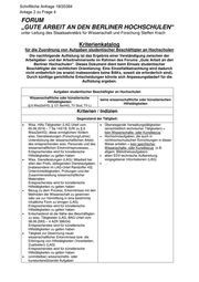 Schriftliche Anfrage 18/20384 Anlage 2 zu Frage 4 FORUM „GUTE ARBEIT AN DEN BERLINER HOCHSCHULEN“ unter Leitung des Staatssekretärs für Wissenschaft und Forschung Steffen Krach Kriterienkatalog für die Zuordnung von Aufgaben studentischer Beschäftigter an Hochschulen Die nachfolgende Auflistung ist das Ergebnis einer Verständigung zwischen der Arbeitgeber- und der Arbeitnehmerseite im Rahmen des Forums „Gute Arbeit an den Berliner Hochschulen“. Dieses Dokument dient beim Einsatz studentischer Beschäftigter der rechtlichen Orientierung. Eine Einzelfallbetrachtung wird dadurch nicht entbehrlich (es ersetzt insbesondere keine BAKs, soweit sie erforderlich sind). Durch künftige gerichtliche Entscheidungen könnte sich Anpassungsbedarf für die Auflistung ergeben. Aufgaben studentischer Beschäftigter an Hochschulen Wissenschaftliche oder künstlerische keine wissenschaftliche oder künstlerischen Hilfstätigkeiten Hilfstätigkeiten (§ 6 WissZeitVG, § 121 BerlHG, TV Stud, TV-L) Kriterien / Indizien Gegenstand der Tätigkeit: Wiss. Hilfs-Tätigkeiten (LAG Urteil vom Überwiegende Verwaltungstätigkeiten 05.06.2018 – 7 Sa 143/18; ErfK zu § 6 (einschließlich technischer Tätigkeiten) = WissZeitVG): diese ermöglichen/ fördern kein Wissenschafts- oder Kunstbezug wiss. Dienstleistungen (Forschung/Lehre); Hochschulaufgaben, die auch in Unterstützung der wissenschaftlichen Arbeit, nichthochschulischen Einrichtungen in dieser des entsprechenden wiss. Personals und des Weise anfallen = kein spezifischer wissenschaftlichen Erkenntnisprozesses, … Wissenschafts- oder Kunstbezug (z.B. Entsprechendes wird für künstlerische allgem. Bibliotheksaufgaben) Hilfstätigkeiten zu gelten haben allein EDV-technische Aufbereitung Wiss. Dienstleistungen (LAG): Mitarbeit bei vorgegebener Informationen (LAG) allen den Profs. obliegenden Dienstaufgaben; … [insbesondere im LAG-Urteil Randziffer 43]: Unterrichtstätigkeiten, Prüfungen und der Zusammenstellung wissenschaftlicher Materialien Entsprechendes wird für künstlerische Hilfstätigkeiten zu gelten haben Bezug zu dem Prozess, Erkenntnisse mit den Methoden der Wissenschaft zu gewinnen oder sie zur Vermittlung in eine bestimmte inhaltliche Form zu bringen (LAG) Entsprechendes wird für künstlerische Hilfstätigkeiten zu gelten haben Entscheidend ist die Nähe des Beschäftigten zu wiss. Tätigkeiten (LAG; BAG Urteil vom 08.06.2005 – 4 AZR 396/04) Entsprechendes wird für künstlerische Hilfstätigkeiten zu gelten haben Tätigkeit zur Gewinnung neuer wissenschaftlicher Erkenntnisse bzw. die Erbringung von Hilfstätigkeiten (Vorarbeiten, Zuarbeiten) (LAG) Entsprechendes wird für künstlerische Hilfstätigkeiten zu gelten haben (unmittelbar) wissenschafts- oder kunstunterstützende Aufgaben