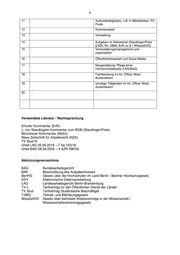 4 11 Aufsichtstätigkeiten, z.B. in Bibliotheken, PC Pools 12 Gremienarbeit 13 Verwaltung 14 Aufgaben im Sekretariat (Staudinger/Preis § 620, Rn. 286d, ErfK zu § 1 WisszeitVG) 15 Veranstaltungsmanagement und - organisation 16 Öffentlichkeitsarbeit und Social Media 17 Neugestaltung/ Pflege einer Hochschulwebseite (LAG/BAG) 18 Fachberatung im Int. Office/ Akad. Auslandsamt 19 sonstige Tätigkeiten im Int. Office/ Akad. Auslandsamt 20 … … … Verwendete Literatur / Rechtsprechung Erfurter Kommentar (ErfK) J. von Staudingers Kommentar zum BGB (Staudinger/Preis) Münchener Kommentar (MüKo) Neue Zeitschrift für Arbeitsrecht (NZA) TV Stud III Urteil LAG 05.06.2018 – 7 Sa 143/18 Urteil BAG 08.06.2005 – 4 AZR 396/04 Abkürzungsverzeichnis BAG Bundesarbeitsgericht BAK Beschreibung des Aufgabenkreises BerlHG Gesetz über die Hochschulen im Land Berlin / Berliner Hochschulgesetz EDV Elektronische Datenverarbeitung LAG Landesarbeitsgericht Berlin-Brandenburg TV-L Tarifvertrag für den Öffentlichen Dienst der Länder TV Stud Tarifvertrag Studentische Beschäftigte TzBfG Teilzeit- und Befristungsgesetz WissZeitVG Gesetz über befristete Arbeitsverträge in der Wissenschaft / Wissenschaftszeitvertragsgesetz