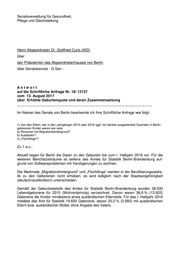 Drucksache 18 / 12 137 Schriftliche Anfrage 18. Wahlperiode Schriftliche Anfrage des Abgeordneten Dr. Gottfried Curio (AfD) vom 13. August 2017 (Eingang beim Abgeordnetenhaus am 24. August 2017) zum Thema: Erhöhte Geburtenquote und deren Zusammensetzung und Antwort vom 11. September 2017 (Eingang beim Abgeordnetenhaus am 13. Sep. 2017) Die Drucksachen des Abgeordnetenhauses sind bei der Kulturbuch-Verlag GmbH zu beziehen. Hausanschrift: Sprosserweg 3, 12351 Berlin-Buckow · Postanschrift: Postfach 47 04 49, 12313 Berlin, Telefon: 6 61 84 84; Telefax: 6 61 78 28.