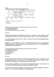 -2- Tabelle 1: Lebendgeborene in Berlin 2015 und I. Halbjahr 2016 nach Staatsangehörigkeit der Eltern Lebendgeborene davon beide Elternteile beide Elternteile Jahr deutsch ausländisch Insgesamt (einschließlich (einschließlich Mutter deutsch / Vater deutsch / deutscher Mütter ausländischer Vater ausländisch Mutter ausländisch ohne Angabe zum Mütter ohne Vater) Angabe zum Vater) 2015 38.030 24.108 6.515 3.572 3.835 I. HJ 20161) 19.830 … 3.993 … … (Datenquelle: Amt für Statistik / Berechnung und Darstellung: SenGPG - I A -) 1) vorläufige Angaben …Angabe fällt später an 2) Wie hoch ist jeweilig die Quote von kinderlosen Frauen im Alter von 45 bis 49 a) ohne Migrationshintergrund? b) mit Migrationshintergrund? c) unter in Deutschland befindlichen Ausländern? Zu 2 a-c.: Gemäß den Ergebnissen des Mikrozensus lebten im Jahr 2016 in Berlin insgesamt etwa 119.000 Frauen im Alter von 45 bis 49 Jahren. Davon waren 27 % (ca. 32.000) kinderlos. Die Kinderlosenquote der Frauen im Alter von 45 bis 49 Jahren ohne Migrationshinter- grund lag bei 30 %. Angaben zu den kinderlosen Frauen mit Migrationshintergrund sowie ausländischer Staatsangehörigkeit werden aufgrund zu kleiner Fallzahlen vom Amt für Statistik Berlin- Brandenburg nicht veröffentlicht. 3) Wie viele Menschen kamen in demselben Zeitraum durch Zuzug nach Berlin a) ohne Migrationshintergrund? b) mit Migrationshintergrund? c) EU-Ausländer? d) sonstige Ausländer? e) insgesamt? Zu 3 a-e.: Aktuell liegen für Berlin die Daten aus der Wanderungsstatistik bis zum Jahr 2015 vor. Für die Berichtszeiträume ab Januar 2016 muss seitens des Amtes für Statistik Berlin- Brandenburg bundesweit mit Verzögerungen gerechnet werden. In der Wanderungsstatistik wird das Merkmal „Migrationshintergrund“ nicht erhoben. Es wird lediglich die Staatsangehörigkeit (deutsch/ausländisch) erfasst. Für das Jahr 2015 wurden insgesamt 182.778 Zuzüge nach Berlin registriert, davon hat- ten 65,6 % (114.338) eine ausländische Staatsbürgerschaft.