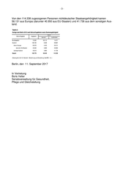 -3- Von den 114.338 zugezogenen Personen nichtdeutscher Staatsangehörigkeit kamen 58.131 aus Europa (darunter 40.950 aus EU-Staaten) und 41.736 aus dem sonstigen Aus- land. Tabelle 3: Zuzüge nach Berlin 2015 nach Herkunftsgebieten sowie Staatsangehörigkeit davon Herkunftsgebiet Insgesamt deutsch ausländisch Bundesgebiet 74.583 60.112 14.471 Ausland 108.195 8.328 99.867 davon: Europa 62.576 4.445 58.131 darunter: EU-Staaten 44.030 3.080 40.950 sonstige Ausland 45.619 3.883 41.736 Gesamt 182.778 68.440 114.338 (Datenquelle: Amt für Statistik / Berechnung und Darstellung: SenGPG - I A -) Berlin, den 11. September 2017 In Vertretung Boris Velter Senatsverwaltung für Gesundheit, Pflege und Gleichstellung