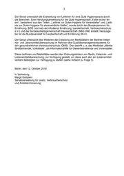 3 Der Senat unterstützt die Erarbeitung von Leitlinien für eine Gute Hygienepraxis durch die Branchen. Eine Handlungsanweisung für die Gute Hygienepraxis „Feste sicher fei- ern“, bestehend aus den Teilen: „Leitlinie zur Guten Hygiene für Veranstalter“ und „Leitli- nie zur Guten Hygiene für ehrenamtliche Helfer“, wurde durch das Bundeszentrum für Ernährung, BZfE (vormals aid infodienst Ernährung, Landwirtschaft, Verbraucherschutz e.V.) und die Bundesarbeitsgemeinschaft Hauswirtschaft (BAG-HW) erstellt, Herausge- ber ist die Bundesanstalt für Landwirtschaft und Ernährung (BLE). Der Senat unterstützt des Weiteren die Erstellung von Merkblättern der Berliner Veteri- när- und Lebensmittelüberwachung im Rahmen des Qualitätsmanagementsystems für den gesundheitlichen Verbraucherschutz (QMS). Dies betrifft u. a. das Merkblatt „Märkte Straßenhandel, Volksfeste“, als Informationshilfe für Gewerbetreibende und Veranstalter. Diese Leitlinien und Merkblätter werden den Ordnungsämtern von Berlin, Veterinär- und Lebensmittelüberwachung, zur Verfügung gestellt, um diese auch den am Lebensmittel- verkehr Beteiligten zur Verfügung zu stellen (siehe Antwort zu Frage 5). Berlin, den 12. Oktober 2018 In Vertretung Margit Gottstein Senatsverwaltung für Justiz, Verbraucherschutz und Antidiskriminierung