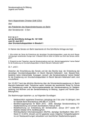 Senatsverwaltung für Bildung, Jugend und Familie Herrn Abgeordneten Christian Gräff (CDU) über den Präsidenten des Abgeordnetenhauses von Berlin über Senatskanzlei - G Sen - Antwort auf die Schriftliche Anfrage Nr. 18/11659 vom 22. Juni 2017 über Grundschulkapazitäten in Biesdorf I ___________________________________________________________________________________ Im Namen des Senats von Berlin beantworte ich Ihre Schriftliche Anfrage wie folgt: 1. Wie schätzt der Senat die Entwicklung der derzeitigen Grundschulkapazitäten, sowie die durch Bauge- nehmigungen anstehenden Zuzüge insb. in Biesdorf-Süd ein (bitte mit Zahlen aus Sicht des Senats unterle- gen)? 2. Entspricht es den Tatsachen, dass die Senatsverwaltung nach den „Monitoringgesprächen“ keinen Bedarf für die Erweiterung von Grundschulkapazitäten im Bezirk Marzahn-Hellersdorf sieht? Zu 1. und 2.: Zwischen der Einschätzung des Senats und der des Bezirks bzgl. der Entwicklung der derzeitigen Grundschulkapazitäten im Bezirk Marzahn-Hellersdorf, insb. Biesdorf-Süd, bestehen keine Unterschiede. Aussagen, wonach „die Senatsverwaltung“ keinen Bedarf für die Erweiterung von Grundschulkapazitäten im Bezirk Marzahn-Hellersdorf sieht, sind unzutreffend. Am 3.5.2017 fand das jährliche Monitoring über die Schulentwicklungsplanung im Bezirk Marzahn-Hellersdorf statt. Teilnehmer waren Vertreter der bezirklichen Ämter für Schule und Stadtplanung sowie der Wohnungsbauleitstelle der Senatsverwaltung für Stadtent- wicklung und Wohnen und der Senatsverwaltung für Bildung, Jugend und Familie (Sen- BildJugFam). Die Abstimmungen basierten u.a. auf folgenden Grundlagen: - Melderechtlich registrierte Einwohner (Jahrgänge der 0 bis unter 16-Jährigen), Amt für Statistik Berlin-Brandenburg (AfS BB) 31.12.2016, - Bevölkerungsprognose für Berlin 2015 - 2030, damalige Senatsverwaltung für Stadtentwicklung und Umwelt (SenStadtUm) Februar 2016, - Modellrechnung zur Entwicklung der Schülerzahlen, Januar 2017 sowie IST- Statistik Oktober 2016, SenBildJugFam, - Wohnbauflächen-Informationssystem (WoFIS), damalige SenStadtUm März 2017, Stand 31.12.2016, (Anzahl und Art geplanter sowie möglicher Fertigstellungstermi- ne von Neubauwohnungen) aktualisiert vom bezirklichen Stadtentwicklungsamt.