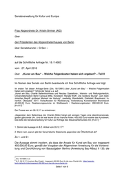 doch Ausdruck von deren Achtung und hoher Akzeptanz in der Bevölkerung. Dies ist grundsätzlich bei den hier aufgeführten Kunstwerken der Fall.“ In der Rechtssprache wird das Wort „grundsätzlich“ im Sinne von „Vom Grundsatz her, aber mit Aus- 8 nahmen, also: "in der Regel" verwendet. 9. Bei welchen der aufgeführten Kunstwerke ist kein „durchgängig geringes Ausmaß an gezieltem Vandalismus, Beschädigungen oder Zerstörungen von diesen öffentlich zugänglichen Kunstwerken“ zu konsternieren? Zu 9.: Der Senatsverwaltung für Kultur und Europa liegen keine Erkenntnisse darüber vor, dass einzelne Kunstwerke verstärkt gezieltem Vandalismus, Beschädigungen oder Zerstörungen ausgesetzt werden. 10. Welche Kunstwerke weichen hier vom aufgeführten Grundsatz „hoher Akzeptanz in der Bevölke- rung“ ab? Zu 10.: Bezüglich der im Fachvermögen der Senatsverwaltung für Kultur und Europa befind- lichen Objekte sind keine Kunstwerke bekannt, die vom aufgeführten Grundsatz „ho- her Akzeptanz in der Bevölkerung“ abweichen. Für die Kunstwerke in Verantwortung der bezirklichen Fachämter bzw. Eigentümerin oder Eigentümer der Liegenschaft liegen der Senatsverwaltung für Kultur und Europa keine Erkenntnisse vor. Berlin, den 14.05.2018 In Vertretung Dr. Torsten Wöhlert Senatsverwaltung für Kultur und Europa 8 http://www.rechtslexikon.net/d/grunds%C3%A4tzlich/grunds%C3%A4tzlich.htm Seite 6 von 6