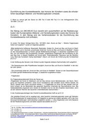 Senatsverwaltung für Kultur und Europa Frau Abgeordnete Dr. Kristin Brinker (AfD) über den Präsidenten des Abgeordnetenhauses von Berlin über Senatskanzlei – G Sen – Antwort auf die Schriftliche Anfrage Nr. 18 / 14903 vom 27. April 2018 über „Kunst am Bau“ – Welche Folgenkosten haben sich ergeben? – Teil II Im Namen des Senats von Berlin beantworte ich Ihre Schriftliche Anfrage wie folgt: Im ersten Teil dieser Anfrage-Serie (Drs. 18/13991) über „Kunst am Bau“ – Welche Folgenkosten haben sich ergeben?“ führte der Senat u.a. auf: „Kunst am Bau, Charité Bettenhochhaus und Neubau Operations-, Intensiv- und Rettungsmedizin, Universitätsmedizin Berlin Campus Mitte, Künstlerin: Renate Wolff, „Die Goldene Stunde“, zum medi- zinischen Begriff „goldener Moment der Heilung“, zweiteilig, Wandreliefs, Edelstahl, Brandwand, In- nenhof, Übergabe: 2017, Vorlaufkosten für Realisierung, Vorbereitung Kunststandort Brandwand: 40.000,00 Euro, Realisierungssumme im Wettbewerb / Realisierungskosten: 280.000,00 Euro. 1 [H.d.V.]“ Der Presse war am 09.12.17 zu entnehmen: „Gegenüber dem Bettenhaus der Charité (Mitte) hängt seit wenigen Tagen eine überdimensionale, golden glänzende Uhr. Und die war teurer als so manche Rolex: 450.000 Euro kostete das Kunstwerk. 2 Das teilte die Senatsverwaltung für Kultur auf Anfrage des Steuerzahlerbundes mit. [H.d.V.]“ 1. Stimmt die Aussage im B.Z.-Artikel vom 09.12.17? 2. Wenn nein, warum gibt der Senat falsche Statements gegenüber der Öffentlichkeit ab? Zu 1. und 2.: Die Aussage stimmt insofern, als dass der Ansatz für Kunst am Bau von insgesamt 450.000,00 Euro, gemäß der Vorgaben der Allgemeinen Anweisung für die Vorberei- tung und Durchführung von Bauaufgaben Berlins (Anweisung Bau-ABau) II 130, die 1 Drs. 18/13991; S.3. 2 B.Z., 09.12.17, Kunst am Bau-Projekt - Insgesamt 450.000 Euro für die neue Charité-Uhr; https://www.bz- berlin.de/berlin/mitte/insgesamt-450-000-euro-fuer-die-neue-charite-uhr Seite 1 von 6