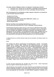 Die beiden weiteren Mitglieder werden von folgenden Verwaltungen entsandt: 1 Vertreterin bzw. Vertreter der für das Bauen zuständigen Senatsverwaltung 1 Vertreterin bzw. Vertreter der für Kultur zuständigen Senatsverwaltung Das Vorschlagsrecht für die Mitglieder erhalten folgende Institutionen, die jeweils bis zu drei Personen benennen können: - Akademie der Künste - Architektenkammer Berlin - Berufsverband Bildender Künstler Berlin (BBK Berlin, Gedok u.a.) - Deutscher Künstlerbund sowie der - Rat der Bürgermeister. Mit dem Vorschlag ist der jeweilige Spartenbezug zu nennen. Über die Berufung entscheidet die für Kultur zuständige Senatsverwaltung. Die Bezirkskommissionen setzen sich aus in der Kunst im öffentlichen Raum erfah- renen professionellen Bildenden Künstlerinnen und Künstlern sowie aus Vertreterin- nen und Vertretern der beteiligten bezirklichen Fachämter (Serviceeinheit Facility Management SE FM, Straßen- und Grünflächenamt SGA, Kultur, Stadtplanung) und den fachlich zuständigen Bezirksstadträtinnen bzw. Bezirksstadträten zusammen. Die Geschäftsführung obliegt den Bezirksstadträtinnen bzw. Bezirksstadträten. 8. Welche Personen aus welchem Gremium haben über das Kunstwerk „Die Goldene Stunde“ ent- schieden? Zu 8.: Der Auslober des offenen zweiphasigen Kunstwettbewerbs „Charité - Universitäts- medizin Berlin, Campus Mitte, Sanierung des Bettenhochhauses und Neubau OP/IST“ war das Land Berlin, vertreten durch die damalige Senatskanzlei - Kulturelle Angelegenheiten in Abstimmung mit der Charité – Universitätsmedizin Berlin Ge- schäftsbereich Technik und Betriebe, Baumanagement (Bauherr). Das Preisgericht tagte am 13. Oktober 2016. Das Gremium wurde gemäß der Richtlinie für Planungs- wettbewerbe (RPW 2013) vom Auslober mit sechs stimmberechtigten Fachpreisrich- terinnen und Fachpreisrichtern sowie fünf stimmberechtigten Sachpreisrichterinnen und Sachpreisrichtern besetzt. Zu den Fachpreisrichterinnen und Fachpreisrichtern gehörten Prof. Tyyne Claudia Pollmann (Vorsitz), Prof. Norbert Rademacher, Michael Sailstorfer, Juliane von Herz, Thomas Locher und Prof. Dr. Bettina Uppenkamp. Zu den Sachpreisrichterinnen und Sachpreisrichtern zählten Jochen Brinkmann, Dr. Da- vid Naegler, Tatjana Quack, Beatrice Günther und Rolf Meyer. Im ersten Teil dieser Anfrage-Serie (Drs. 18/13991) über „Kunst am Bau“ – Welche Folgenkosten haben sich ergeben?“ führte der Senat des Weiteren u.a. aus: „Über die Resonanz eines Kunstwerks oder eines Gedenkortes aus der Bevölkerung werden keine gezielten Befragungen durchgeführt, und es werden weder im öffentlichen Raum noch für Gebäude mit Kunst am Bau Besucherzahlen erfasst. Ein durchgängig geringes Ausmaß an gezieltem Vanda- lismus, Beschädigungen oder Zerstörungen von diesen öffentlich zugänglichen Kunstwerken ist je- Seite 5 von 6