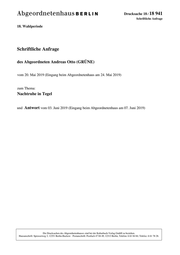 Drucksache 18 / 18 941 Schriftliche Anfrage 18. Wahlperiode Schriftliche Anfrage des Abgeordneten Andreas Otto (GRÜNE) vom 20. Mai 2019 (Eingang beim Abgeordnetenhaus am 24. Mai 2019) zum Thema: Nachtruhe in Tegel und Antwort vom 03. Juni 2019 (Eingang beim Abgeordnetenhaus am 07. Juni 2019) Die Drucksachen des Abgeordnetenhauses sind bei der Kulturbuch-Verlag GmbH zu beziehen. Hausanschrift: Sprosserweg 3, 12351 Berlin-Buckow · Postanschrift: Postfach 47 04 49, 12313 Berlin, Telefon: 6 61 84 84; Telefax: 6 61 78 28.
