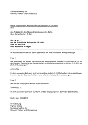 Senatsverwaltung für Umwelt, Verkehr und Klimaschutz Herrn Abgeordneten Andreas Otto (Bündnis 90/Die Grünen) über den Präsidenten des Abgeordnetenhauses von Berlin über Senatskanzlei - G Sen - Antwort auf die Schriftliche Anfrage Nr. 18/18941 vom 20. Mai 2019 über Nachtruhe in Tegel Im Namen des Senats von Berlin beantworte ich Ihre Schriftliche Anfrage wie folgt: Frage 1: Wie viele Anträge von Bürgern zur Einhaltung des Nachtflugverbots zwischen 23:00 Uhr und 6:00 Uhr für den Flughafen Tegel sind bei der Obersten Luftfahrt- und Luftsicherheitsbehörde im Zeitraum 01.01.2018 bis 20.05.2019 eingegangen? Antwort zu 1: In dem genannten Zeitraum sind keine Anträge, jedoch 1.018 Schreiben mit vergleichbarer Intention bei der Obersten Luftfahrt- und Luftsicherheitsbehörde eingegangen. Frage 2: Wie viele der eingegangenen Anträge wurden beantwortet? Antwort zu 2: In dem genannten Zeitraum wurden 1.018 der eingegangenen Schreiben beantwortet. Berlin, den 03.06.2019 In Vertretung Ingmar Streese Senatsverwaltung für Umwelt, Verkehr und Klimaschutz
