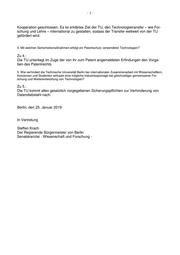 - 2- Kooperation geschlossen. Es ist erklärtes Ziel der TU, den Technologietransfer – wie For- schung und Lehre – international zu gestalten, sodass der Transfer weltweit von der TU gefördert wird. 4. Mit welchen Sicherheitsmaßnahmen erfolgt ein Patentschutz verwendeter Technologien? Zu 4.: Die TU unterliegt im Zuge der von ihr zum Patent angemeldeten Erfindungen den Vorga- ben des Patentrechts. 5. Wie verhindert die Technische Universität Berlin bei internationaler Zusammenarbeit mit Wissenschaftlern, Konzernen und Studenten wirksam eine mögliche Industriespionage bei gleichzeitiger gemeinsamer For- schung und Weiterentwicklung von Technologien? Zu 5.: Die TU kommt allen gesetzlich vorgegebenen Sicherungspflichten zur Verhinderung von Datendiebstahl nach. Berlin, den 25. Januar 2019 In Vertretung Steffen Krach Der Regierende Bürgermeister von Berlin Senatskanzlei - Wissenschaft und Forschung -