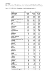 Anlage zu 1. Wie viele Studenten welcher Nationen studieren zurzeit an der Technischen Universität Berlin? Bitte nach männlichen und weiblichen Studenten aufschlüsseln innerhalb der Staatsangehörigkeit. Stand: 01.12.2018 (inkl. Beurlaubte, ohne Vorstudieneinrichtung ) Land M W Summe Deutschland 17.864 8.296 26.160 China (VR) 587 422 1.009 Türkei 365 289 654 Indien 365 96 461 Arabische Republ. Syrien 312 51 363 Polen 155 161 316 Russische Föderation 127 166 293 Iran 174 111 285 Vietnam 150 100 250 Indonesien 167 72 239 Ägypten 150 68 218 Tunesien 164 39 203 Griechenland 125 73 198 Italien 112 69 181 Bulgarien 82 93 175 Spanien 97 53 150 Korea, Republik 71 78 149 Frankreich 91 52 143 Pakistan, Islamische Rep. 124 14 138 Ukraine 60 64 124 Kolumbien 79 41 120 Mexiko 81 33 114 Österreich 72 36 108 USA 57 42 99 Brasilien 50 34 84 Albanien 39 38 77 Kamerun 55 20 75 Israel 45 21 66 Nepal 51 10 61 Afghanistan 42 16 58 Taiwan 28 29 57 Libanon 51 4 55 Rumänien 26 26 52 Ungarn 36 13 49 Bangladesch 38 10 48 Jemen 44 3 47 Niederlande 29 18 47 Kroatien 28 17 45 Jordanien 32 11 43 Vereinigtes Königreich 31 11 42 1