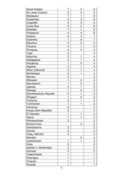 Saudi-Arabien 7 2 9 Sri Lanka (Ceylon) 5 4 9 Moldawien 7 1 8 Guatemala 5 3 8 Ungeklärt 5 3 8 Costa Rica 6 2 8 Slowakei 7 1 8 Philippinen 4 4 8 Estland 4 3 7 Südafrika 1 6 7 Mauritius 3 2 5 Panama 4 1 5 Paraguay 2 3 5 Togo 4 4 Myanmar 3 1 4 Madagaskar 3 1 4 Hongkong 1 3 4 Algerien 3 1 4 Benin (Dahome) 3 1 4 Montenegro 2 1 3 Bahrain 3 3 Äthiopien 1 2 3 Neuseeland 1 2 3 Uganda 2 1 3 Senegal 1 2 3 Dominikanische Republik 2 1 3 Singapur 1 2 3 Tansania 2 1 3 Turkmenien 1 1 2 Honduras 2 2 Kongo (Dem.Republik) 2 2 El Salvador 1 1 2 Island 1 1 2 Elfenbeinküste 2 2 Burkina Faso 2 2 Kambodscha 2 2 Guinea 2 2 Palau, MACAU 2 2 Namibia 2 2 Liechtenstein 1 1 2 Kuba 2 2 Serbien u. Montenegro 2 2 Surinam 2 2 Tadschikistan 1 1 Nicaragua 1 1 Uruguay 1 1 Ruanda 1 1 3