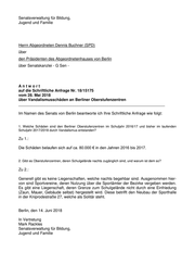 Senatsverwaltung für Bildung, Jugend und Familie Herrn Abgeordneten Dennis Buchner (SPD) über den Präsidenten des Abgeordnetenhauses von Berlin über Senatskanzlei - G Sen - Antwort auf die Schriftliche Anfrage Nr. 18/15175 vom 28. Mai 2018 über Vandalismusschäden an Berliner Oberstufenzentren ___________________________________________________________________ Im Namen des Senats von Berlin beantworte ich Ihre Schriftliche Anfrage wie folgt: 1. Welche Schäden sind den Berliner Oberstufenzentren im Schuljahr 2016/17 und bisher im laufenden Schuljahr 2017/2018 durch Vandalismus entstanden? Zu 1.: Die Schäden belaufen sich auf ca. 80.000 € in den Jahren 2016 bis 2017. 2. Gibt es Oberstufenzentren, deren Schulgelände nachts zugänglich sind, und warum ist dem so? Zu 2.: Generell gibt es keine Liegenschaften, welche nachts begehbar sind. Ausgenommen hier- von sind Sportvereine, deren Nutzung über die Sportämter der Bezirke vergeben werden. Es gibt eine Liegenschaft, deren Grenze zum Schulgelände nicht durch eine Einfriedung (Zaun, Mauer, Gebäude selbst) hergestellt wird. Diese betrifft den Neubau der Sporthalle in der Kniprodestraße 27, welche als Solitär steht. Berlin, den 14. Juni 2018 In Vertretung Mark Rackles Senatsverwaltung für Bildung, Jugend und Familie