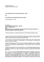 Drucksache 18 / 16 701 Schriftliche Anfrage 18. Wahlperiode Schriftliche Anfrage der Abgeordneten Emine Demirbüken-Wegner (CDU) vom 11. Oktober 2018 (Eingang beim Abgeordnetenhaus am 11. Oktober 2018) zum Thema: Zweite Nachfrage zur Schriftlichen Anfrage 18/13774 „Wir setzen den IMP um …“ – Wie steht es damit im Bereich Soziales (3)? und Antwort vom 26. Oktober 2018 (Eingang beim Abgeordnetenhaus am 30. Okt. 2018) Die Drucksachen des Abgeordnetenhauses sind bei der Kulturbuch-Verlag GmbH zu beziehen. Hausanschrift: Sprosserweg 3, 12351 Berlin-Buckow · Postanschrift: Postfach 47 04 49, 12313 Berlin, Telefon: 6 61 84 84; Telefax: 6 61 78 28.