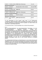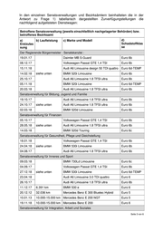 In den einzelnen Senatsverwaltungen und Bezirksämtern beinhalteten die in der Antwort zu Frage 1) tabellarisch dargestellten Zurverfügungstellungen die nachfolgend aufgelisteten Dienstwagen: Betroffene Senatsverwaltung (jeweils einschließlich nachgelagerter Behörden) bzw. betroffenes Bezirksamt a) b) Laufleistung c) Marke und Modell d) Erstzulas Schadstoffklas sung se Der Regierende Bürgermeister - Senatskanzlei - 19.01.17 Daimler MB S-Guard Euro 6b 08.12.17 Volkswagen Passat GTE 1,4 TSI Euro 6b 15.11.18 Audi A6 Limousine design 50 TDI quattro Euro 6d-TEMP 14.02.18 siehe unten BMW 520i Limousine Euro 6b 25.10.17 Audi A6 Limousine 1.8 TFSI ultra Euro 6b 05.11.18 BMW 520i Limousine Euro 6d-TEMP 20.03.18 Audi A6 Limousine 1.8 TFSI ultra Euro 6b Senatsverwaltung für Bildung, Jugend und Familie 19.10.17 Audi A6 Limousine 1.8 TFSI ultra Euro 6b 24.10.17 siehe unten Audi A6 Limousine 1.8 TFSI ultra Euro 6b 02.03.18 BMW 520d Limousine Euro 6b Senatsverwaltung für Finanzen 05.10.17 Volkswagen Passat GTE 1,4 TSI Euro 6b 28.05.18 siehe unten Audi A6 Limousine 1.8 TFSI ultra Euro 6b 14.03.18 BMW 520d Touring Euro 6c Senatsverwaltung für Gesundheit, Pflege und Gleichstellung 18.01.18 Volkswagen Passat GTE 1,4 TSI Euro 6b 24.04.18 siehe unten BMW 530i Limousine Euro 6b 04.08.17 Audi A6 Limousine 1.8 TFSI ultra Euro 6b Senatsverwaltung für Inneres und Sport 09.03.18 BMW 730Ld Limousine Euro 6c 04.09.17 Volkswagen Passat GTE 1,4 TSI Euro 6b 27.12.18 siehe unten BMW 530i Limousine Euro 6d-TEMP 23.04.18 Audi A6 Limousine 3.0 TDI quattro Euro 6 26.10.17 Audi A6 Limousine 1.8 TFSI ultra Euro 6b 11.12.17 6.391 km BMW 530 e Euro 6 20.12.12 32.036 km Mercedes Benz E 300 Bluetec Hybrid Euro 5 10.01.13 10.000-15.000 km Mercedes Benz E 200 NGT Euro 5 19.11.18 10.000-15.000 km Mercedes Benz E 200 Euro 6 Senatsverwaltung für Integration, Arbeit und Soziales Seite 3 von 6