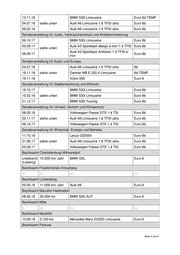 13.11.18 BMW 530i Limousine Euro 6d-TEMP 04.07.18 siehe unten Audi A6 Limousine 1.8 TFSI ultra Euro 6b 26.02.18 Audi A6 Limousine 1.8 TFSI ultra Euro 6b Senatsverwaltung für Justiz, Verbraucherschutz und Antidiskriminierung 09.10.17 BMW 530i Limousine Euro 6b 05.09.17 Audi A3 Sportback design e-tron 1.4 TFSI Euro 6b siehe unten Audi A3 Sportback Ambition 1.4 TFSI e- 06.09.17 Euro 6b tron Senatsverwaltung für Kultur und Europa 04.07.18 Audi A6 Limousine 1.8 TFSI ultra 6b 16.11.18 siehe unten Daimler MB E 220 d Limousine 6d-TEMP 19.11.18 Volvo S90 Euro 6 Senatsverwaltung für Stadtentwicklung und Wohnen 16.10.17 BMW 530i Limousine Euro 6b 15.02.18 siehe unten BMW 530i Limousine Euro 6b 21.12.17 BMW 530i Touring Euro 6b Senatsverwaltung für Umwelt, Verkehr und Klimaschutz 08.05.18 Volkswagen Passat GTE 1,4 TSI Euro 6b 03.11.17 siehe unten Audi A6 Limousine 1.8 TFSI ultra Euro 6b 06.10.17 Volkswagen Passat GTE 1,4 TSI Euro 6b Senatsverwaltung für Wirtschaft, Energie und Betriebe 11.10.18 Lexus GS300h Euro 6b 31.08.17 siehe unten Audi A6 Limousine 1.8 TFSI ultra Euro 6b 05.09.17 Volkswagen Passat GTE 1,4 TSI Euro 6b Bezirksamt Charlottenburg-Wilmersdorf unbekannt 10.000 km/ Jahr BMW G5L Euro 6 (Leasing) Bezirksamt Friedrichshain-Kreuzberg --- --- --- --- Bezirksamt Lichtenberg 05.06.18 11.000 km/ Jahr Audi A6 Euro 6 Bezirksamt Marzahn-Hellersdorf 08.06.18 25.000 km BMW 520i AUT Euro 6 Bezirksamt Mitte -- --- --- --- Bezirksamt Neukölln 10.09.18 3.100 km Mercedes-Benz E220D Limousine Euro 6 Bezirksamt Pankow Seite 4 von 6