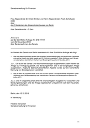 Senatsverwaltung für Finanzen Frau Abgeordnete Dr. Kristin Brinker und Herrn Abgeordneten Frank Scholtysek (AfD) über den Präsidenten des Abgeordnetenhauses von Berlin über Senatskanzlei - G Sen - Antwort auf die Schriftliche Anfrage Nr. S18/ 17147 vom 26. November 2018 über Beratungsfirmen des Senats ----------------------------------------------------------------------------------------------------------------- Im Namen des Senats von Berlin beantworte ich Ihre Schriftliche Anfrage wie folgt: 1. Wie viele Beratungsfirmen beraten die einzelnen Senatsverwaltungen und bezirklichen Fachämter und welche Kosten sind dafür jeweils seit 2013 jährlich angefallen? (Bitte Auflistung nach Senats- verwaltung bzw. bezirklichem Fachamt und Beratungsfirma getrennt für jedes Jahr!) Zu 1.: Die durch die Senats- und Bezirksverwaltungen aufgelieferten Daten werden als Anlage zur Verfügung gestellt. Die Beratungsfirmen sind in der beigefügten Anlage ausgewiesen. Aufgrund datenschutzrechtlicher Aspekte wurde auf die namentliche Nennung von Einzelpersonen verzichtet. 2. Was ist dafür im Doppelhaushalt 2018 und 2019 auf Senats- und Bezirksebene eingestellt? (Bitte Auflistung nach Senatsverwaltung bzw. bezirklichem Fachamt und Beratungsfirma getrennt für jedes Jahr!) Zu 2.: Die im Doppelhaushalt 2018/19 veranschlagten Ausgaben für Gutachten und Beratungsleistungen sind der Anlage kapitelscharf und getrennt nach den Haushalts- jahren zu entnehmen. Berlin, den 13.12.2018 In Vertretung Fréderic Verrycken Senatsverwaltung für Finanzen 1/1