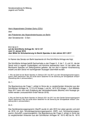Senatsverwaltung für Bildung, Jugend und Familie Herrn Abgeordneten Christian Goiny (CDU) über den Präsidenten des Abgeordnetenhauses von Berlin über Senatskanzlei - G Sen - Antwort auf die Schriftliche Anfrage Nr. 18/13 147 vom 12. Januar 2018 über Mittel für Schulsanierung im Bezirk Spandau in den Jahren 2011-2017 ___________________________________________________________________ Im Namen des Senats von Berlin beantworte ich Ihre Schriftliche Anfrage wie folgt: Die Schriftliche Anfrage betrifft Sachverhalte zu den Fragen 3., 5. bis 7., 9. und 10., die der Senat nicht in eigener Zuständigkeit und Kenntnis beantworten kann. Er hat daher das Bezirksamt Spandau um Stellungnahme gebeten, die von dort in eigener Verantwortung erstellt und dem Senat mit nachfolgenden Aussagen übermittelt wurden. 1. Wie viel Geld hat der Bezirk Spandau im Zeitraum 2011 bis 2017 aus dem Schulanlagensanierungspro- gramm (SSP) bekommen? Wie viel wurde davon tatsächlich für die Sanierung der Schulgebäude verbaut? (Darstellung bitte in Jahresscheiben.) Zu 1.: Die Beantwortung der Frage 1. erfolgt im Sinne der zu vergleichenden Antworten aus den Schriftlichen Anfragen Nr. 17/15 415 Anlage 1 und Nr. 18/12 972 Anlage 1. Zum Mittelab- fluss 2017 kann erst nach Erstellung des Jahresabschlusses (Bezirke) eine Aussage ge- troffen werden (voraussichtlich Ende Februar 2018). 2. Wie viel Geld hat der Bezirk Spandau im Zeitraum 2011 bis 2017 aus dem Sanitär-Sanierungsprogramm (SaniP) bekommen? Wie viel wurde davon tatsächlich für die Sanierung der Schulgebäude verbaut? (Dar- stellung bitte in Jahresscheiben.) Zu 2.: Das Sanitärsanierungsprogramm (SaniP) wurde im Jahr 2015 ins Leben gerufen und wird ab 2018 mit dem Schulanlagensanierungsprogramm (SSP) zum Schulsanierungspro- gramm (SchulSP) zusammengeführt. Die Beantwortung der Frage 2. erfolgt im Sinne der zu vergleichenden Antworten aus den Schriftlichen Anfragen Nr. 18/10 462 bis Nr. 18/10