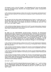 -2- 473 Anlage 2 und Nr. 18/10 671 Anlage 1. Zum Mittelabfluss 2017 kann erst nach Erstel- lung des Jahresabschlusses (Bezirke) eine Aussage getroffen werden (voraussichtlich Ende Februar 2018). 3. Wie viel Geld hat der Bezirk Spandau im Zeitraum 2011 bis 2017 für den baulichen Unterhalt bekommen? Wie viel wurde davon tatsächlich für die Sanierung der Schulgebäude verbaut? (Darstellung bitte in Jahres- scheiben.) Zu 3.: Für die Jahre 2012 bis 2016 erfolgt die Beantwortung der Frage 3. im Sinne der zu ver- gleichenden Antwort des Bezirks aus den Schriftlichen Anfragen Nr. 18/10 239 Anlage 3 und Nr. 18/10 465 Anlage 4. Die Angaben des Bezirks für die Mittel der Jahre 2011 und 2017 sind in der Anlage 1 ergänzt. 4. Wie viel Geld hat der Bezirk Spandau im Zeitraum 2011 bis 2017 aus dem Sondervermögen Infrastruktur der wachsenden Stadt (SIWA) bekommen? Wie viel wurde davon tatsächlich für die Sanierung der Schulge- bäude verbaut? (Darstellung bitte in Jahresscheiben.) Zu 4.: Die Mittel aus dem SIWA/SIWANA (Sondervermögen Infrastruktur der Wachsenden Stadt/Sondervermögen Infrastruktur der Wachsenden Stadt und Errichtung eines Nachhal- tigkeitsfonds) werden seit 2015 ausgereicht. Die Abrechnung der Ausgaben erfolgt kumu- lativ (keine Jährlichkeit) und ist mit Stand 31.12.2017 in der Schriftlichen Anfrage Nr. 18/13 061 Anlage 1 und Anlage 2 beantwortet worden. In der Schriftlichen Anfrage Nr. 17/18 284 Anlage 3 ist der Abrechnungsstand per 31.12.2015 dargestellt. Die Darstellung der Ab- rechnungen zum 31.12.2016 erfolgte in der Schriftlichen Anfrage Nr. 18/10 239 Anlage 1. 5. Wie viel Geld hat der Bezirk Spandau im Zeitraum 2011 bis 2017 aus dem Förderprogramm Stadtumbau bekommen? Wie viel wurde davon tatsächlich für die Sanierung der Schulgebäude verbaut? (Darstellung bitte in Jahresscheiben.) 6. Wie viel Geld hat der Bezirk Spandau im Zeitraum 2011 bis 2017 aus dem Förderprogramm Bildung im Quartier bekommen? Wie viel wurde davon tatsächlich für die Sanierung der Schulgebäude verbaut? (Dar- stellung bitte in Jahresscheiben.) 7. Wie viel Geld hat der Bezirk Spandau im Zeitraum 2011 bis 2017 aus dem Förderprogramm BENE be- kommen? Wie viel wurde davon tatsächlich für die Sanierung der Schulgebäude verbaut? (Darstellung bitte in Jahresscheiben.) 9. Wie viel Geld hat der Bezirk Spandau im Zeitraum 2011 bis 2017 für die Schulsanierung aus sonstigen Förderpro-grammen und Mitteln, die nicht durch SSP, Sani-P, baulichen Unterhalt, SIWA, Stadtumbau, Bil- dung im Quartier, BENE sowie Brennpunktschulen abgedeckt sind, bekommen? Wie viel wurde davon tat- sächlich für die Sanierung der Schulgebäude verbaut? (Darstellung bitte in Jahresscheiben und gegliedert nach Bezeichnung der jeweiligen Zuweisung.) Zu 5. bis 7. und 9.: Für die Jahre 2012 bis 2016 erfolgt die Beantwortung der Fragen 5., 6., 7., und 9. im Sinne der zu vergleichenden Antwort des Bezirks aus der Schriftlichen Anfrage Nr. 18/10 465 Anlage 5. Die Angaben des Bezirks für die Mittel der Jahre 2011 und 2017 sind in der An- lage 2 ergänzt.