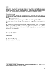 NOV Das Risiko, aus der NOV in Anspruch genommen zu werden, beträgt gemäß § 3 Ab- satz 6 NOV maximal 3,8 Mrd. €. Dies entspricht jedoch nicht dem tatsächlich beste- henden Risiko. Laut der dem Abgeordnetenhaus vorliegenden letzten Planfortschrei- bung (s. Fn. 4) ist keine Inanspruchnahme des Landeshaushaltes zu erwarten. Risikoabschirmung Von den in 2002 im Rahmen der Risikoabschirmung gewährten Garantien bestehen derzeit noch die beiden folgenden (allesamt gegenüber dem Konzern der Landesbank Berlin): - Buchwertgarantie und - Freistellung von Verpflichtungen aus Patronatserklärungen der LBBH Daneben bestehen noch geringe Risiken aus bereits festgestellten Kreditgarantiefäl- 6 len . Zu Entwicklung und Stand der Garantien der Risikoabschirmung sowie zur geplanten Aufhebung der NOV erstellt die Senatsverwaltung für Finanzen derzeit eine ausführli- che Vorlage, die dem Abgeordnetenhaus in Kürze vorgelegt wird. Auf diese Vorlage wird bereits jetzt verwiesen. Berlin, den 04.06.2019 In Vertretung Dr. Margaretha Sudhof Senatsverwaltung für Finanzen 6 Zum Stand von Buchwert- und Kreditgarantie s. auch Vierteljahresberichte zur NOV, zuletzt 25. VJB zum IV. Quartal 2018 vom 22.03.2019 (DS 18/1837) 3/3
