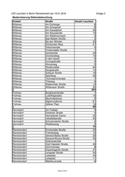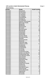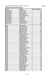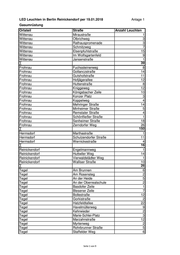 LED Leuchten in Berlin Reinickendorf per 19.01.2018 Anlage 1 Gasumrüstung Ortsteil Straße Anzahl Leuchten Tegel Tile-Brügge-Weg 45 Tegel Ziekowstraße 7 ∑ 150 Waidmannslust Waidmannsluster Damm 1 ∑ 1 LED-Leuchten infolge Gasumrüstung gesamt: 382 Seite 2 von 9