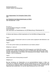 Senatsverwaltung für Umwelt, Verkehr und Klimaschutz Herrn Abgeordneten Tim-Christopher Zeelen (CDU) über den Präsidenten des Abgeordnetenhauses von Berlin über Senatskanzlei - G Sen - Antwort auf die Schriftliche Anfrage Nr. 18/13439 vom 07.02.2018 über Nachrüsten von Straßenlaternen mit LED-Beleuchtung in Reinickendorf (II) Im Namen des Senats von Berlin beantworte ich Ihre Schriftliche Anfrage wie folgt: Frage 1: Auf welchen Straßen in Reinickendorf wurden die Leuchten bereits ausgetauscht (bitte Maßnahmen nach Ortsteilen auflisten)? Frage 2: Um wie viele Leuchten handelt es sich (bitte Maßnahmen nach Ortsteilen auflisten)? Antwort zu 1 und zu 2: In Reinickendorf werden mit Stand 19.01.2018 insgesamt rund 2.300 LED-Leuchten betrieben. Die Leuchten sind entweder Ersatz von Gasleuchten (382 Stück) oder Ersatz maroder Elektroleuchten (1.916 Stück). Die Verteilung auf die Ortsteile / Straßen ist den Anlagen 1 und 2 zu entnehmen. Frage 3: Welche Kosten hat die Umrüstung bislang verursacht? Antwort zu 3: Bei der Umrüstung von Gasleuchten ist von durchschnittlichen Kosten in Höhe von 4.500 Euro je Lichtpunkt auszugehen. Bei der Modernisierung von Elektroleuchten etwa von 300 Euro je Lichtpunkt. Sofern Fördermittel genutzt werden können, reduziert sich der Eigenanteil des Landes Berlin z.B. bei der Gasumrüstung auf bis zu 50 Prozent. 1