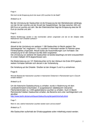 Frage 4: Wie hoch ist die Einsparung durch die neuen LED-Leuchten für die Stadt? Antwort zu 4: Bei der Umrüstung der Gasleuchten ist die Einsparung bei den Betriebskosten abhängig von der Art der Leuchte und der Anzahl der Gasglühkörper. Sie liegt zwischen 300 und 600 Euro je Leuchte und Jahr. Bei den Elektroleuchten liegt die Einsparung etwa bei 50 Euro je Leuchte und Jahr. Frage 5: Welche Straßenzüge werden in den kommenden Jahren umgerüstet und wie ist der Zeitplan (bitte Maßnahmen nach Ortsteilen auflisten)? Antwort zu 5: Aktuell ist die Umrüstung von weiteren 1.188 Gasleuchten im Bezirk geplant. Der überwiegende Teil, insgesamt 1.123 Leuchten in Hermsdorf werden im Rahmen eines Förderprojektes umgerüstet. Aktuell laufen die Ausschreibungen zum Vorhaben. Die Umsetzung ist für den Zeitraum bis Mai 2020 vorgesehen. Die Umrüstung von weiteren 65 Gasleuchten ist bereits beauftragt und wird voraussichtlich im ersten Halbjahr 2018 abgeschlossen sein. Die Modernisierung von 121 Elektroleuchten ist für den Zeitraum bis Ende 2018 geplant, weitere Vorhaben befinden sich derzeit in der Vorbereitung. Die Verteilung auf die Ortsteile / Straßen ist den Anlagen 3 und 4 zu entnehmen. Frage 6: Wird der Bestand der historischen Leuchten in historischen Ortskernen in Reinickendorf auch in Zukunft erhalten bleiben? Antwort zu 6: Um die historische Gasbeleuchtung zu erhalten, wurde in Abstimmung mit dem Landesdenkmalamt entschieden, in ausgewiesenen städtebaulich relevanten Flächendenkmalen ca. 3.300 gasbetriebene Leuchten zu erhalten. Auch im Bezirk Reinickendorf bleiben Gasleuchten erhalten, die Bereiche sind unter nachfolgendem Link abrufbar: http://www.berlin.de/senuvk/bauen/beleuchtung/de/gaslicht/erhalt.shtml Frage 7: Wenn 6. nein, welche historischen Leuchten werden wann und wo ersetzt? Antwort zu 7: Alle Gasleuchten außerhalb der Erhaltungsgebiete sollen mittelfristig ersetzt werden. 2