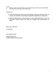 Frage 8: a. Wird die Leuchtkraft der Straßenlaternen durch die Nachrüstung mit LED-Leuchten beeinträchtigt? b. Wie wirkt sich die Umrüstung auf die LUX-Werte aus? Antwort zu 8: a) Sofern die Gasleuchte durch einen LED-Nachbau ersetzt wird, bleibt die Form der Leuchte, die Lichtfarbe und die Beleuchtungsstärke vergleichbar zur Gasleuchte. b) Sofern die Beleuchtung in einer Straße bzw. einem Straßenabschnitt von mehr als 200 Metern Länge erneuert wird, gelten die Vorgaben des Lichtkonzeptes von Berlin. Berlin, den 14.02.2018 In Vertretung Jens-Holger Kirchner ................................ Senatsverwaltung für Umwelt, Verkehr und Klimaschutz 3