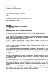 Senatsverwaltung für Integration, Arbeit und Soziales Herrn Abgeordneten Maik Penn (CDU) über den Präsidenten des Abgeordnetenhauses von Berlin über Senatskanzlei - G Sen - Antwort auf die Schriftliche Anfrage Nr. 18/18448 vom 02.04.2019 über Inklusionstaxis in Berlin – Stand der Umsetzung II ------------------------------------------------------------------------------------------------------------------------------- Im Namen des Senats von Berlin beantworte ich Ihre Schriftliche Anfrage wie folgt: 1. Laut Drucksache 18/17592 sind bisher drei Anträge auf Bezuschussung von fünf Inklusionstaxis gestellt worden und diese befänden sich in der Bearbeitung. Ist die Bearbeitung unterdessen abgeschlossen und falls ja, mit welchen Ergebnissen? Zu 1.: Es sind zwei Anträge positiv beschieden. Bei dem dritten Antrag muss der Unternehmende noch fehlende Unterlagen nachreichen. 2. Wie viele weitere Anträge auf Bezuschussung wie vieler Inklusionstaxis sind seit Beantwortung der Drs. 18/17592 gestellt worden? Zu 2.: Aktuell liegen insgesamt neun Anträge für insgesamt 19 Inklusionstaxis vor (inkl. der Anträge für die bereits bestehenden SoVD-Projektfahrzeuge und der zwei bereits beschiedenen Anträge). Es sind somit seit der letzten Anfrage sechs Anträge hinzugekommen. 3. In Drs. 18/17592 erklärt der Senat ebenfalls, das Landesamt für Gesundheit und Soziales (LAGeSo) sei damit befasst, die Möglichkeiten der Förderung bekannter zu machen. Welche Maßnahmen werden hierzu wann umgesetzt? Zu 3.: Im engen Austausch mit den Gewerbeverbänden, Gewerbevertretenden und der Taxi-Innung wird verstärkt über die Möglichkeiten der Förderung informiert und gleichzeitig in Gesprächen eruiert, welche möglichen Hemmnisse aus Sicht der Taxi- Unternehmenden bestehen, von den angebotenen Fördermöglichkeiten Gebrauch zu machen. So wurde u. a. am 06.03.2019 ein Expertengespräch zwischen Frau Senatorin Breitenbach und den genannten Vertretenden geführt. Im Ergebnis wurden die Inhalte und Vorgaben in der Förderrichtlinie nicht als Hemmnisse genannt. 1