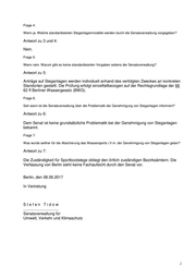 Frage 4: Wenn ja. Welche standardisierten Steganlagenmodelle werden durch die Senatsverwaltung vorgegeben? Antwort zu 3 und 4: Nein. Frage 5: Wenn nein. Warum gibt es keine standardisierten Vorgaben seitens der Senatsverwaltung? Antwort zu 5: Anträge auf Steganlagen werden individuell anhand des verfolgten Zweckes an konkreten Standorten gestellt. Die Prüfung erfolgt einzelfallbezogen auf der Rechtsgrundlage der §§ 62 ff Berliner Wassergesetz (BWG). Frage 6: Seit wann ist die Senatsverwaltung über die Problematik der Genehmigung von Steganlagen informiert? Antwort zu 6: Dem Senat ist keine grundsätzliche Problematik bei der Genehmigung von Steganlagen bekannt. Frage 7: Was wurde seither für die Absicherung des Wassersports i.V.m. der Genehmigung von Steganlagen getan? Antwort zu 7: Die Zuständigkeit für Sportbootstege obliegt den örtlich zuständigen Bezirksämtern. Die Verfassung von Berlin sieht keine Fachaufsicht durch den Senat vor. Berlin, den 08.06.2017 In Vertretung Stefen Tidow ................................ Senatsverwaltung für Umwelt, Verkehr und Klimaschutz 2