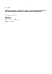 -2- Zu 4. bis 6.: Aus ähnlichen Gründen erfolgt auch bei privaten Schulen keine Veröffentlichung. Aller- dings werden die privaten Schulträger zu diesem Sachverhalt aktuell abgefragt. Berlin, den 14. Juni 2017 In Vertretung Mark Rackles Senatsverwaltung für Bildung, Jugend und Familie