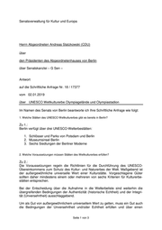 Senatsverwaltung für Kultur und Europa Herrn Abgeordneten Andreas Statzkowski (CDU) über den Präsidenten des Abgeordnetenhauses von Berlin über Senatskanzlei – G Sen – Antwort auf die Schriftliche Anfrage Nr. 18 / 17377 vom 02.01.2019 über UNESCO Weltkulturerbe Olympiagelände und Olympiastadion Im Namen des Senats von Berlin beantworte ich Ihre Schriftliche Anfrage wie folgt: 1. Welche Stätten des UNESCO Weltkulturerbes gibt es bereits in Berlin? Zu 1.: Berlin verfügt über drei UNESCO-Welterbestätten: 1. Schlösser und Parks von Potsdam und Berlin 2. Museumsinsel Berlin 3. Sechs Siedlungen der Berliner Moderne 2. Welche Voraussetzungen müssen Stätten des Weltkulturerbes erfüllen? Zu 2.: Die Voraussetzungen regeln die Richtlinien für die Durchführung des UNESCO- Übereinkommens zum Schutz des Kultur- und Naturerbes der Welt. Maßgebend ist der außergewöhnliche universelle Wert einer Kulturstätte. Vorgeschlagene Güter sollten daher mindestens einem oder mehreren von sechs Kriterien für Kulturerbe- stätten entsprechen. Bei der Entscheidung über die Aufnahme in die Welterbeliste sind weiterhin die übergreifenden Bedingungen der Authentizität (historische Echtheit) und der Integri- tät (Unversehrtheit) ausschlaggebend. Um als Gut von außergewöhnlichem universellem Wert zu gelten, muss ein Gut auch die Bedingungen der Unversehrtheit und/oder Echtheit erfüllen und über einen Seite 1 von 3