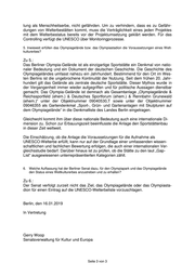tung als Menschheitserbe, nicht gefährden. Um zu verhindern, dass es zu Gefähr- dungen von Welterbestätten kommt, muss die Verträglichkeit eines jeden Projektes mit dem Welterbestatus bereits vor der Projektumsetzung geklärt werden. Für das Controlling verfügt die UNESCO über Monitoringprozesse. 5. Inwieweit erfüllen das Olympiagelände bzw. das Olympiastadion die Voraussetzungen eines Welt- kulturerbes? Zu 5.: Das Berliner Olympia-Gelände ist als einzigartige Sportstätte ein Denkmal von natio- naler Bedeutung und ein Dokument der deutschen Geschichte. Die Geschichte des Olympiageländes umfasst nahezu ein Jahrhundert. Bestimmend für den Ort im Wes- ten Berlins ist die ungebrochene Kontinuität der Nutzung. Seit dem frühen 20. Jahr- hundert gilt das Gelände als zentrale deutsche Sportstätte. Dieser Mythos wurde in der Vergangenheit immer wieder aufgegriffen und für politische Aussagen dienstbar gemacht. Das Olympia-Gelände ist demnach als Gesamtanlage „Olympiagelände & Reichssportfeld (ehem.) & Deutsches Sportforum (ehem.) & Rennbahn Grunewald (ehem.)“ unter der Objektnummer 09040530,T sowie unter der Objektnummer 09046355 als Gartendenkmal „Sport-, Grün- und Gartenanlagen mit Skulpturen auf dem Olympiagelände“ in die Denkmalliste des Landes Berlin eingetragen. Gleichwohl kommt ihm über diese nationale Bedeutung auch eine internationale Di- mension zu. Schon zur Erbauungszeit beeinflusste die Anlage den Sportstättenbau in dieser Zeit weltweit. Die Einschätzung, ob die Anlage die Voraussetzungen für die Aufnahme als UNESCO-Welterbe erfüllt, kann nur auf der Grundlage einer umfassenden wissen- schaftlichen und fachlichen Bewertung erfolgen, die auch einer internationalen Ver- gleichsstudie bedarf. Darüber hinaus ist zu prüfen, ob die Stätte zu den laut „Gap- List“ ausgewiesenen unterrepräsentierten Kategorien zählt. 6. Welche Auffassung hat der Berliner Senat dazu, für den Olympiapark und das Olympiagelände den Status eines Weltkulturerbes anzustreben und zu erhalten? Zu 6.: Der Senat verfolgt zurzeit nicht das Ziel, das Olympiagelände oder das Olympiasta- dion für einen Eintrag auf die UNESCO-Welterbeliste vorzuschlagen. Berlin, den 16.01.2019 In Vertretung Gerry Woop Senatsverwaltung für Kultur und Europa Seite 3 von 3