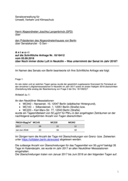 Drucksache 18 / 16 412 Schriftliche Anfrage 18. Wahlperiode Schriftliche Anfrage des Abgeordneten Joschka Langenbrinck (SPD) vom 05. September 2018 (Eingang beim Abgeordnetenhaus am 11. September 2018) zum Thema: Noch immer dicke Luft in Neukölln – Was unternimmt der Senat im Jahr 2018? und Antwort vom 21. September 2018 (Eingang beim Abgeordnetenhaus am 27. Sep. 2018) Die Drucksachen des Abgeordnetenhauses sind bei der Kulturbuch-Verlag GmbH zu beziehen. Hausanschrift: Sprosserweg 3, 12351 Berlin-Buckow · Postanschrift: Postfach 47 04 49, 12313 Berlin, Telefon: 6 61 84 84; Telefax: 6 61 78 28.