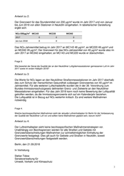 Antwort zu 2: Der Grenzwert für das Stundenmittel von 200 µg/m³ wurde im Jahr 2017 und von Januar bis Juni 2018 von allen Stationen in Neukölln eingehalten. In tabellarischer Darstellung ergibt sich: NO2>200µg/m³ MC143 MC220 MC042 2017 0 0 0 Jan-Jun 2018 0 0 0 Das NO2-Jahresmittel betrug im Jahr 2017 an MC143 48 µg/m³, an MC220 49 µg/m³ und an MC042 26 µg/m³. Der Grenzwert für das NO2-Jahresmittel von 40 µg/m³ wurde also im Jahr 2017 an MC042 eingehalten; an MC143 und MC220 wurde er überschritten. Frage 3: Wie bewertet der Senat die Qualität der an den Neuköllner Luftgütemessstationen gemessenen Luft im Jahr 2017 sowie im ersten Halbjahr 2018? Antwort zu 3: Die Werte für NO2 lagen an den Neuköllner Straßenmessstationen im Jahr 2017 oberhalb des zum Schutz der menschlichen Gesundheit zulässigen Grenzwertes von 40 µg/m³ im Jahresmittel. Für alle weiteren Luftschadstoffe wurden die in der 39. Verordnung zum Bundes-Immissionsschutzgesetz definierten Grenz- und Zielwerte an den Neuköllner Messstationen eingehalten. Für das Jahr 2018 kann noch keine Bewertung der Luftqualität getroffen werden, da die Immissionsgrenzwerte sich auf ein Kalenderjahr beziehen. Die Luftqualität ist in Bezug auf NO2 weiterhin kritisch. Es sind weitere Maßnahmen notwendig. Frage 4: Welche bezirksspezifischen Maßnahmen sieht der aktuelle Luftreinhalteplan für Berlin für die Verbesserung der Qualität der Neuköllner Luft vor und sollten keine Maßnahmen geplant sein, warum nicht? Antwort zu 4: Der Luftreinhalteplan sieht keine bezirksspezifischen Maßnahmenstrategien vor. Unabhängig von Bezirksgrenzen werden für alle Straßen und Gebiete mit Grenzwertüberschreitungen Maßnahmen zur schnellstmöglichen Einhaltung der Grenzwerte festgelegt. Dies gilt auch für Gebiete und Straßen in Neukölln, soweit Grenzwertüberschreitungen festgestellt werden. Berlin, den 21.09.2018 In Vertretung Stefan Tidow Senatsverwaltung für Umwelt, Verkehr und Klimaschutz 3